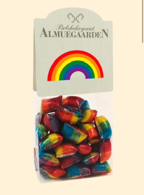 Bolcher i regnbuefarvet med den dejligste smag af blåbær. En ekstra lille hyggelig ting til den der elsker farver og smag af blåbær. Bolcherne er fra det velkendte Almuegaarden i tivoli.