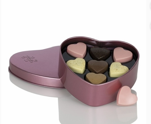 63g fyldte hjerte chokolader i sød lyserød metal æske.