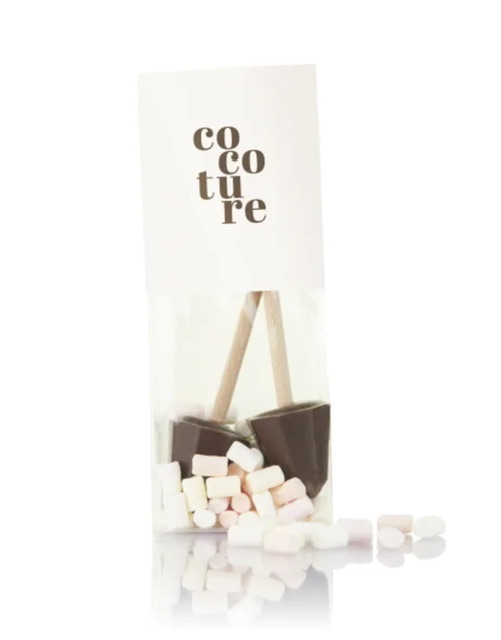 Nyd en dejlig kop chokolade med hyggelige skumfiduser. 2 stk pinde med lys chokolade og skumfiduser til ekstra hygge. Perfekt til unge som gamle.